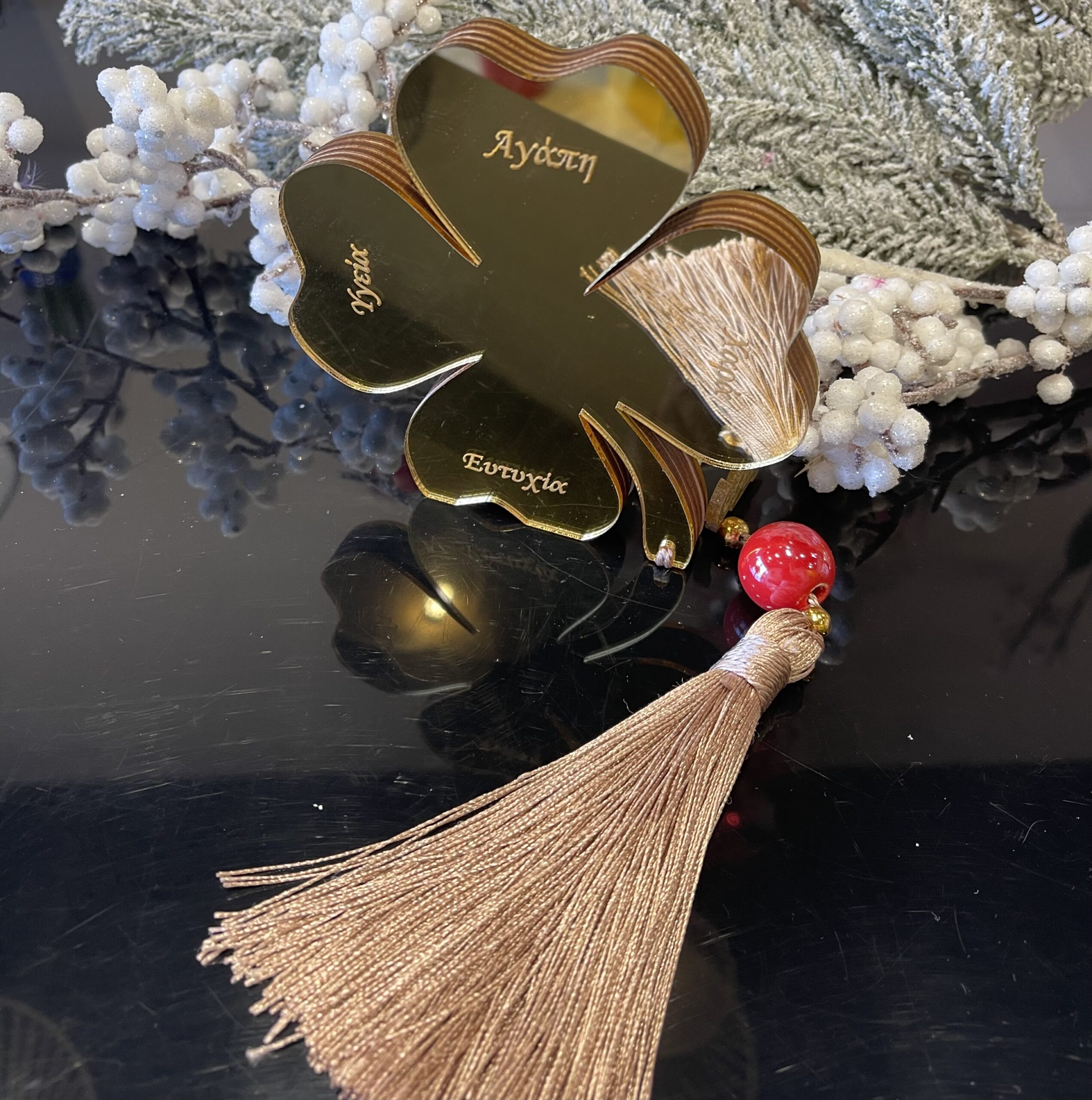 Γούρι τετράφυλλο με κάθε φύλλο να φέρει «Αγάπη – Υγεία – Τύχη – Ευτυχία». Premium minimal αισθητική και κομψό.