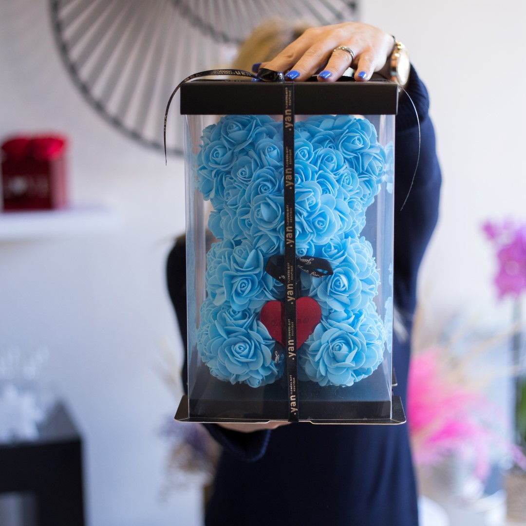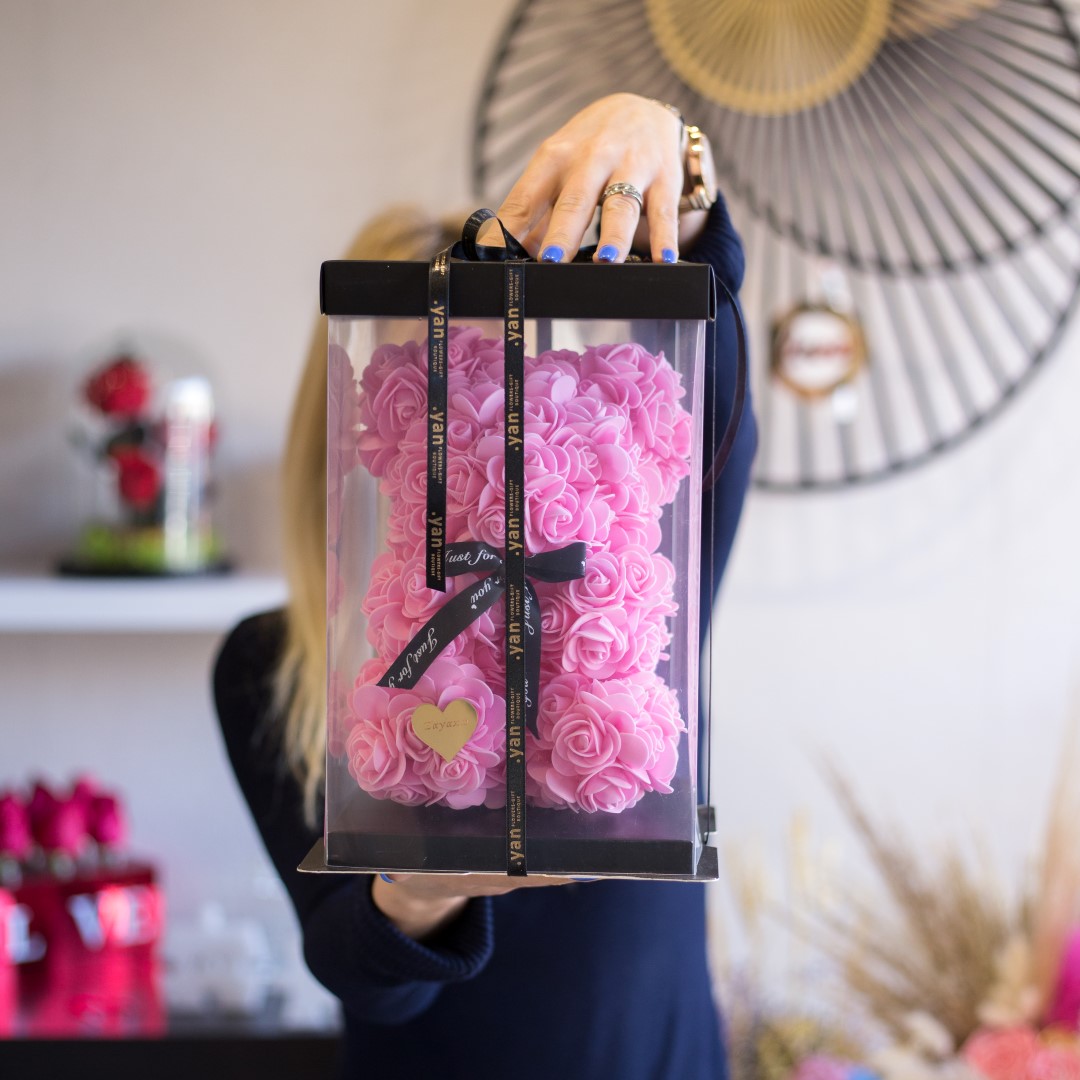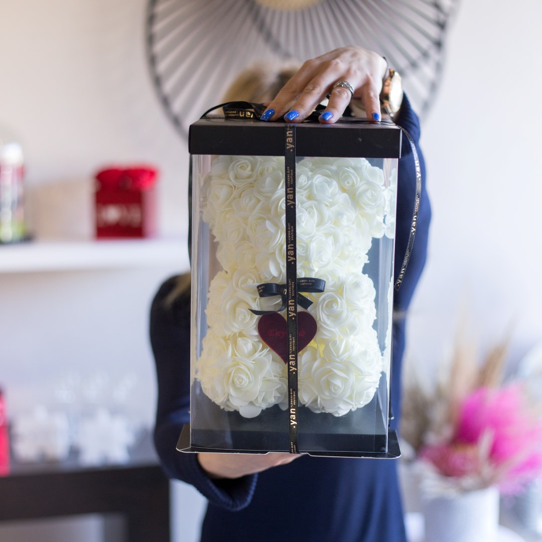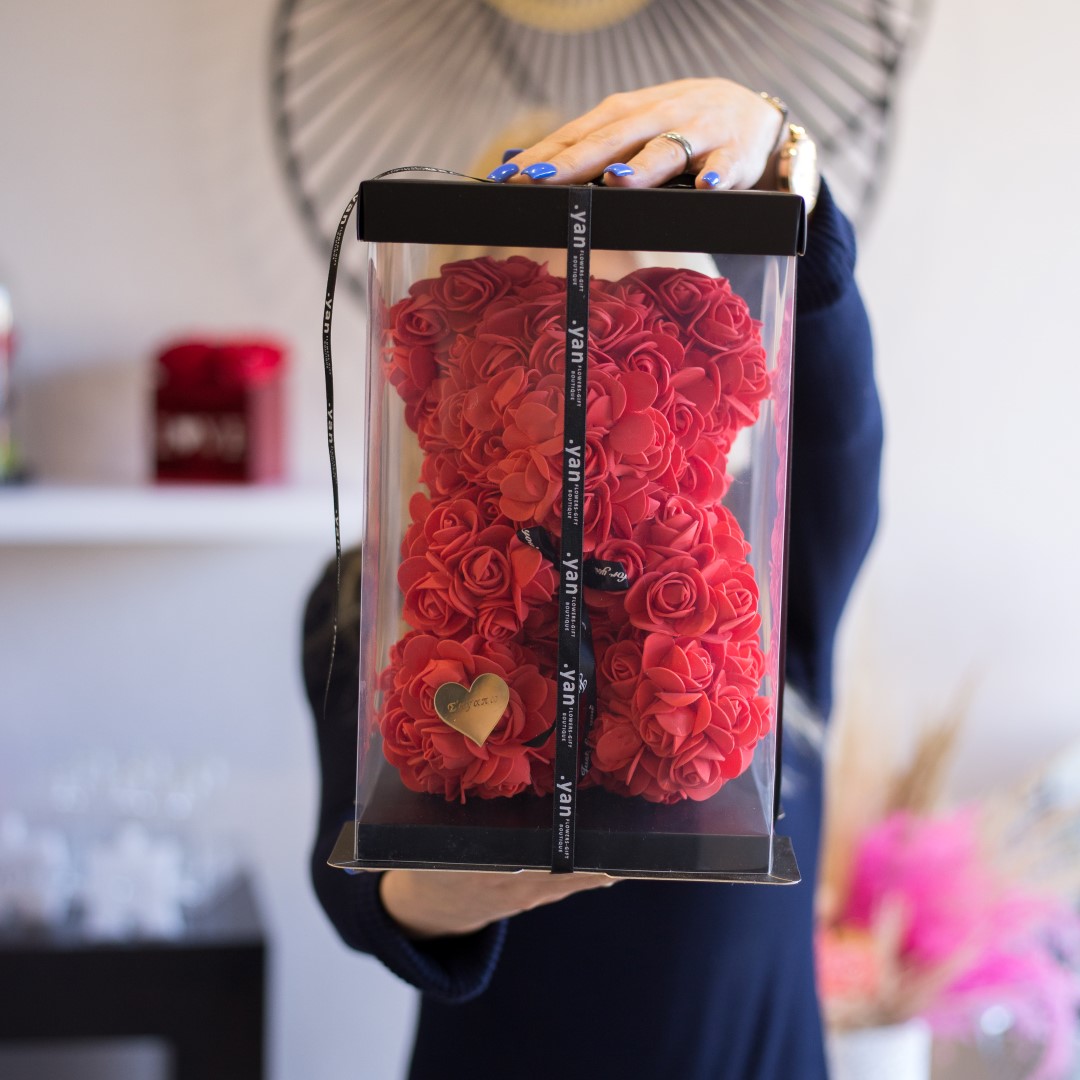 Το πιο όμορφο και γλυκό αρκουδάκι που σίγουρα θα λατρέψει. Ένα υπέροχο δώρο για εκείνη διαθέσιμο σε 4 χρώματα. Ένα αρκουδάκι σχηματισμένο με μικρά πλαστικά τριαντάφυλλα σε υπέροχη συσκευασία δώρου. Μικρή λεπτομέρεια με καρδούλα από plexiglass που έχετε τη δυνατότητα να χαράξετε πάνω το μήνυμά σας!